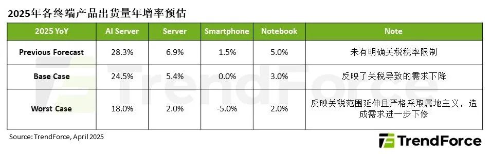 若后续各国关税反制引发较大规模的贸易壁垒,造成全球性通胀或消费力下降,CSP和OEM等终端客户或进一步放缓布局AI Server设施,出货量年增率将缩减为18%左右。