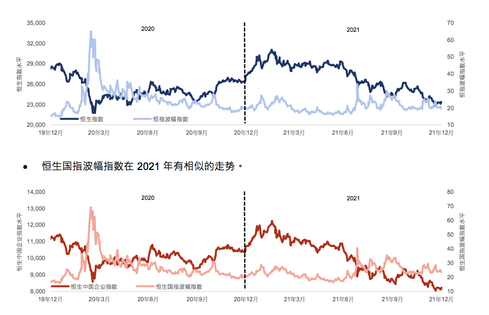 尽管2021年恒指顶点及谷底之间的波幅为8340点,国指顶点及谷底之间的波幅为4186点,均高于2020年的波幅。2020年恒指波幅为7360点,国指为2860点。但度量恒指和国指30个日历预期波幅的恒指波幅指数和恒生国指波幅指数,显示出2021年市场⻛险减低。