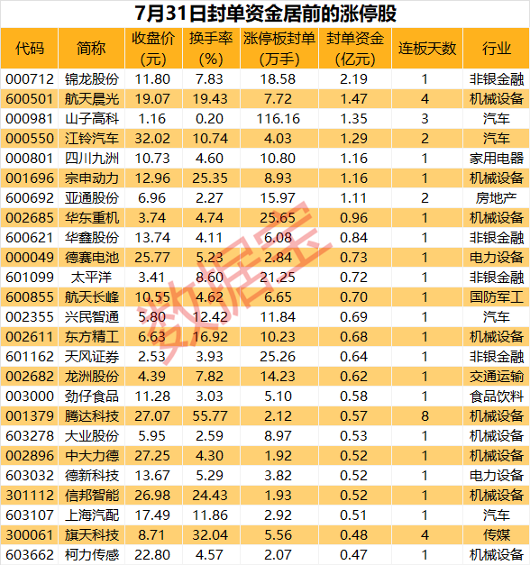 以封单金额计算,7股封单资金超亿元,锦龙股份、航天晨光、山子高科封单资金居前,分别为2.19亿元、1.47亿元、1.35亿元。