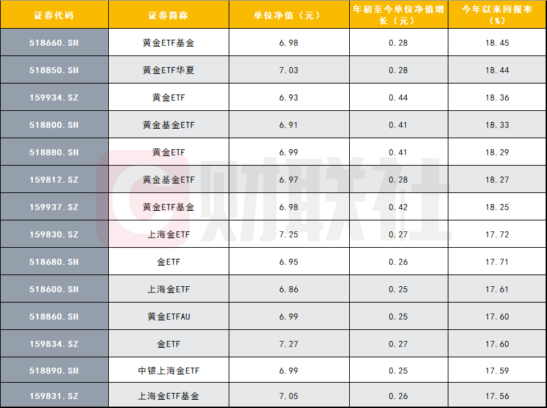 在市场分析人士看来,尽管对其他国家的关税暂停90天,但美国对亚洲最大的金属消费市场继续加征关税,使已经白热化的贸易战升级,让黄金的避险属性再次提升,14只场内黄金etf今日再次出现集体跳空高开高走势头,今年以来收益增长率已超17.5%。