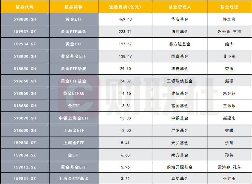 目前规模在百亿元以上的共有4只黄金ETF,分别归属于华安基金、博时基金、易方达基金、国泰基金,当前规模分别为469.43亿元、223.71亿元、197.57亿元、138.49亿元,今年来规模增幅达63.70%、49.10%、49.13%、93.91%。