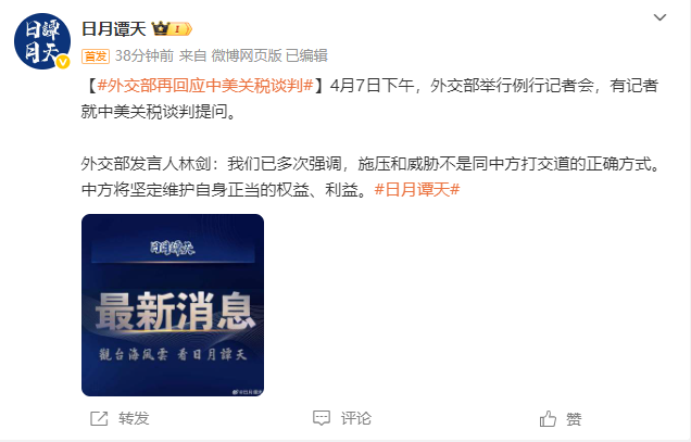 有记者就中美关税谈判提问。外交部发言人林剑:我们已多次强调,施压和威胁不是同中方打交道的正确方式。中方将坚定维护自身正当的权益、利益。