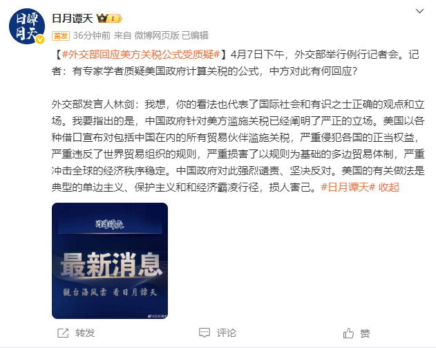 外交部再回应美方所谓对等关税:必然遭到国际社会的普遍反对