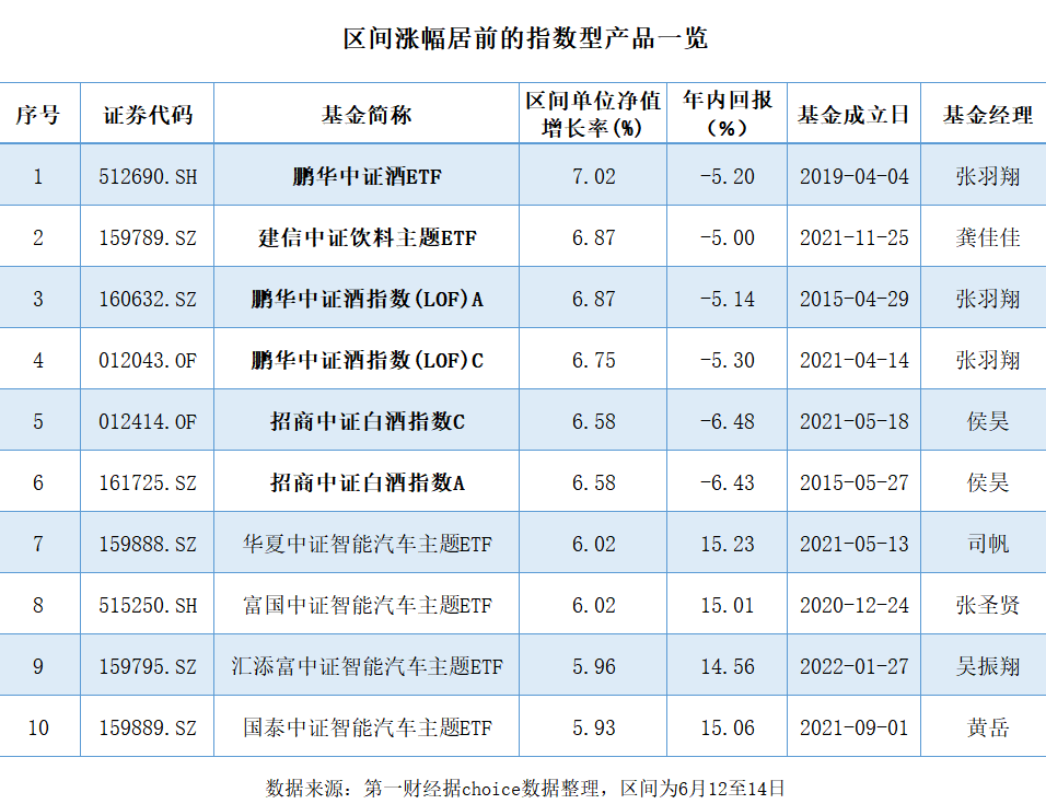受益于板块带动,相关主题基金也开启了上涨行情,甚至“霸榜”前列。Choice数据显示,在已有数据的指数型开放式基金中,6月12日至14日的累计涨幅超过6.5%的均为重仓白酒板块的基金产品。