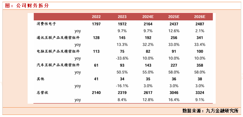 消费电子业务这块,受益于行业的复苏,预期今年可以保持大个位数正增长。苹果AI手机更新换代预期带动立讯业绩增长。预计2024-26年消费性电子营收分别为2164、2437、2487亿元,同比+10%、+13%、+2%。通信业务:有望受益AI浪潮下服务器、光模块、铜连接、散热等需求增长。我们预计2024-26年通讯互联产品及精密组件营收分别为192、256、341亿元,同比+32%、+33%、+33%。汽车业务:公司持续强化Tier1定位,和奇瑞和广汽的合作在加速,这块预期可以保持高增长。预计202426年汽车互联产品及精密组件营收分别为143、227、358亿元,同比+55%、+58%、+58%。公司预期2024年预期实现营收2600-2700亿左右,预期实现利润130亿利润左右,yoy+25%。给过去10年平均估值25倍,公司合理市值3250亿,目前2370亿市值,预期还有30-40%的上涨空间。
