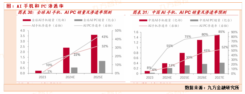 AI手机、AIPC销量有望快速攀升。伴随AI生成式应该用快速迭代普及,手机行业有望进入功能手机、智能手机之后的AI手机时代,根据Gartner数据,预计全球AI手机销量从2024年2.4亿部增长至2025年的3.6亿部,渗透率从22%提升至32%,IDC预计中国AI手机销量有望从2024年的0.4亿部增长至2027年1.5亿部,渗透率从13%提升至52%。AIPC方面,随着软硬件的升级积累,AIPC有望实现端边协同计算、跨设备互联接力甚至是个人大模型微调训练,从而拉动AIPC销量快速增长,Gartner预计全球AIPC销量从2024年0.5亿台增长至2025年1.2亿台,渗透率从22%提升至43%,IDC预计中国AIPC销量将从2024年的0.2亿台提升至2027年0.4亿台,渗透率从55%提升至85%。苹果具备完备的终端产品线以及芯片、OS、应用的全栈能力,在AI领域亦持续布局,叠加外部AI合作赋能,有望带动iPhone、iPad、Macbook、AppleWatch、VisionPro等产品线销量增长,立讯作为其多个产品线的整机和零组件核心供应商,有望长期受益。