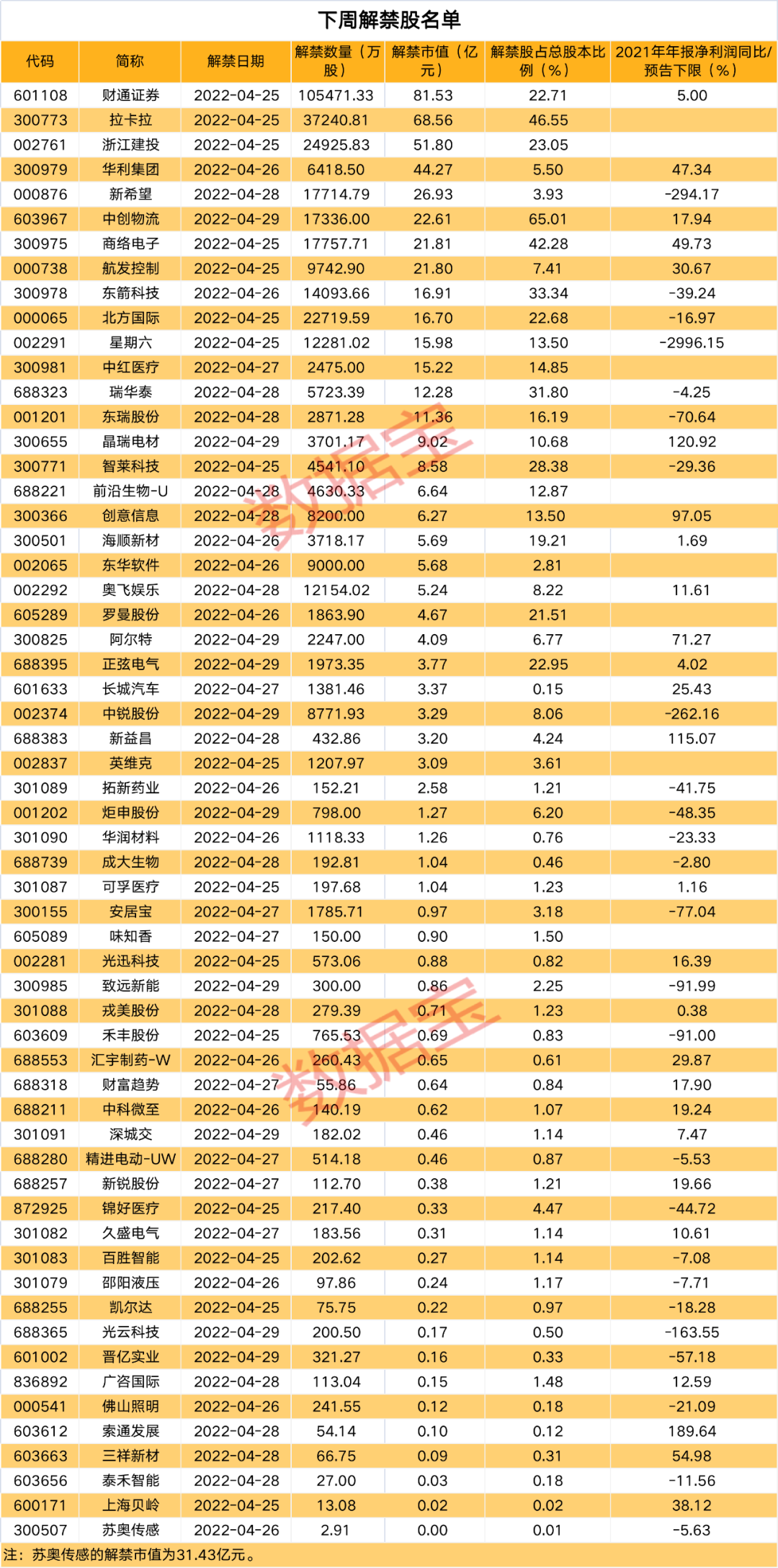 财通证券的解禁市值最大,下周将有10.55亿股上市流通,主要是配股一般股份,解禁市值达81.53亿元。
