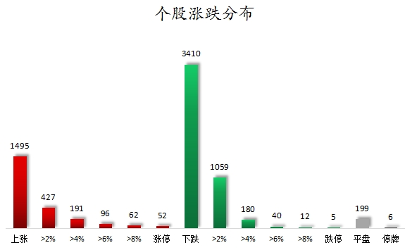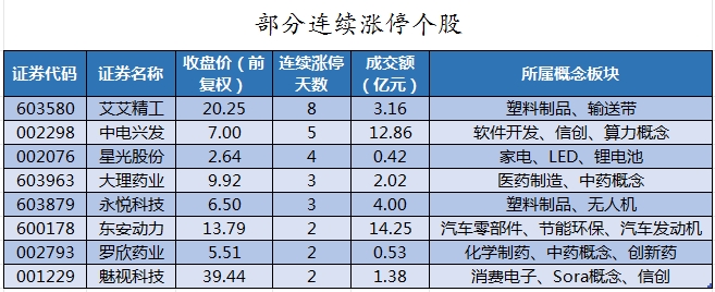 截至收盘,沪深两市合计1495只个股上涨,3410只个股下跌,平盘个股199只,停牌的个股6只。不含当日上市新股,共有52只个股涨停,5只个股跌停。连续涨停天数看,艾艾精工已连收8个涨停板,连续涨停板数量最多。