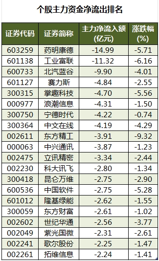 此外,3347只个股被主力资金净卖出,其中,80股被主力资金净卖出超1亿元。主力资金净流出最多的个股是药明康德,净流出金额为14.99亿元;主力资金净流出居前的个股还有工业富联、北汽蓝谷、赛力斯、掌趣科技、浪潮信息,净流出金额分别为11.32亿元、9.9亿元、4.84亿元、4.7亿元、4.31亿元。