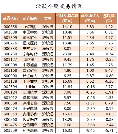 活跃个股方面,北向资金今日净买入较多的有五粮液、中国中免、紫金矿业、恒瑞医药、美的集团,净买入金额分别为5.83亿元、5.56亿元、4.34亿元、2.55亿元、2.47亿元。北向资金净卖出较多的有药明康德、立讯精密、迈瑞医疗、贵州茅台、阳光电源,净卖出金额分别为9.45亿元、3.68亿元、2.79亿元、2.55亿元、2.39亿元。