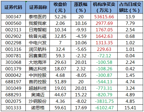 盘后龙虎榜数据显示,今日机构席位资金合计净买入约4.89亿元。其中,净买入的个股6只,净卖出的个股9只。机构净买入最多的股票是泰格医药,净买入金额约5.36亿元;机构净买入居前的还有我爱我家、日海智能等股。机构净卖出最多的股票是诺思格,净卖出金额约6102.47万元;机构净卖出居前的还有沙钢股份、奥浦迈等股。