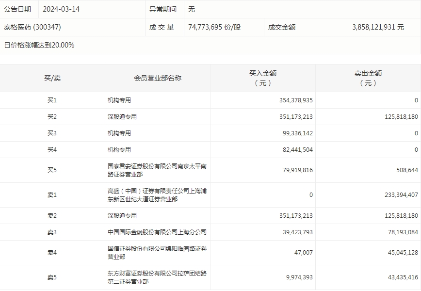 泰格医药今天涨停。盘后数据显示,3个机构出现在龙虎榜单上,合计净买入5.36亿元;国泰君安证券股份有限公司南京太平南路证券营业部买入7991.98万元,同时卖出50.86万元;中国国际金融股份有限公司上海分公司买入3942.38万元,同时卖出7819.31万元。