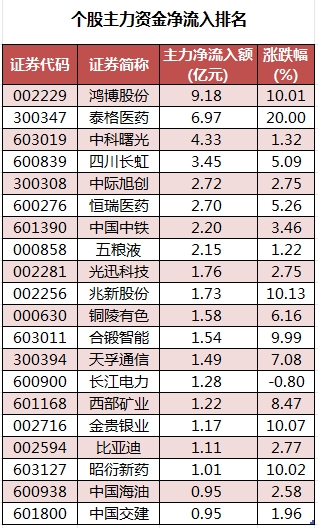 个股来看,今日有1755只个股获主力资金净流入,其中,18股获主力资金净流入超1亿元。鸿博股份主力资金净流入最多,净流入金额为9.18亿元;主力资金净流入居前的个股还有泰格医药、中科曙光、四川长虹、中际旭创、恒瑞医药,流入金额分别为6.97亿元、4.33亿元、3.45亿元、2.72亿元、2.7亿元。