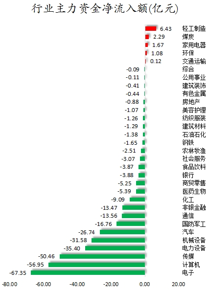 从行业板块来看,申万所属的31个一级行业,今日有5个行业板块主力资金呈现净流入,其中,轻工制造行业板块主力资金净流入最多,净流入金额为6.43亿元;行业板块主力资金净流入居前的还有煤炭、家用电器,净流入金额分别为2.29亿元、1.67亿元。26个行业板块主力资金呈现净流出,其中,电子行业板块主力资金净流出最多,净流出金额为67.35亿元;行业板块主力资金净流出靠前的还有计算机、传媒、电力设备、机械设备、汽车,净流出金额分别为56.95亿元、50.46亿元、35.4亿元、31.58亿元、26.74亿元。