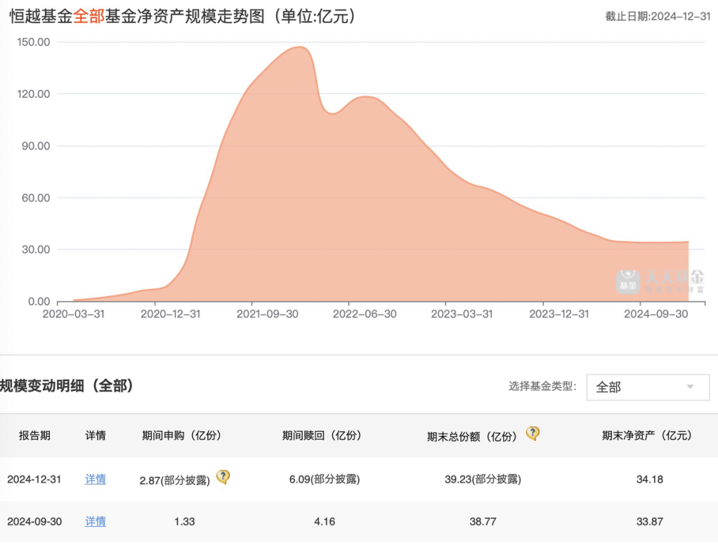 而高楠于2023年1月离职后,恒越基金的规模也回落。截至去年四季度末,该公司的公募管理规模仅为34.18亿元。