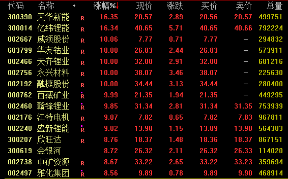 锂矿概念今日大幅拉升,截至收盘,亿纬锂能涨超16%,华友钴业、天齐锂业、融捷股份、永兴材料等涨停,赣锋锂业逼近涨停,盛新锂能涨超9%。