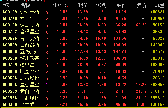 酒类股今日再度走强,截至收盘,舍得酒业、古井贡酒、山西汾酒、五粮液、酒鬼酒、泸州老窖等涨停斩获两连板;贵州茅台涨超6%,突破1600元整数关口。此外,青岛啤酒涨近9%,重庆啤酒涨逾5%。