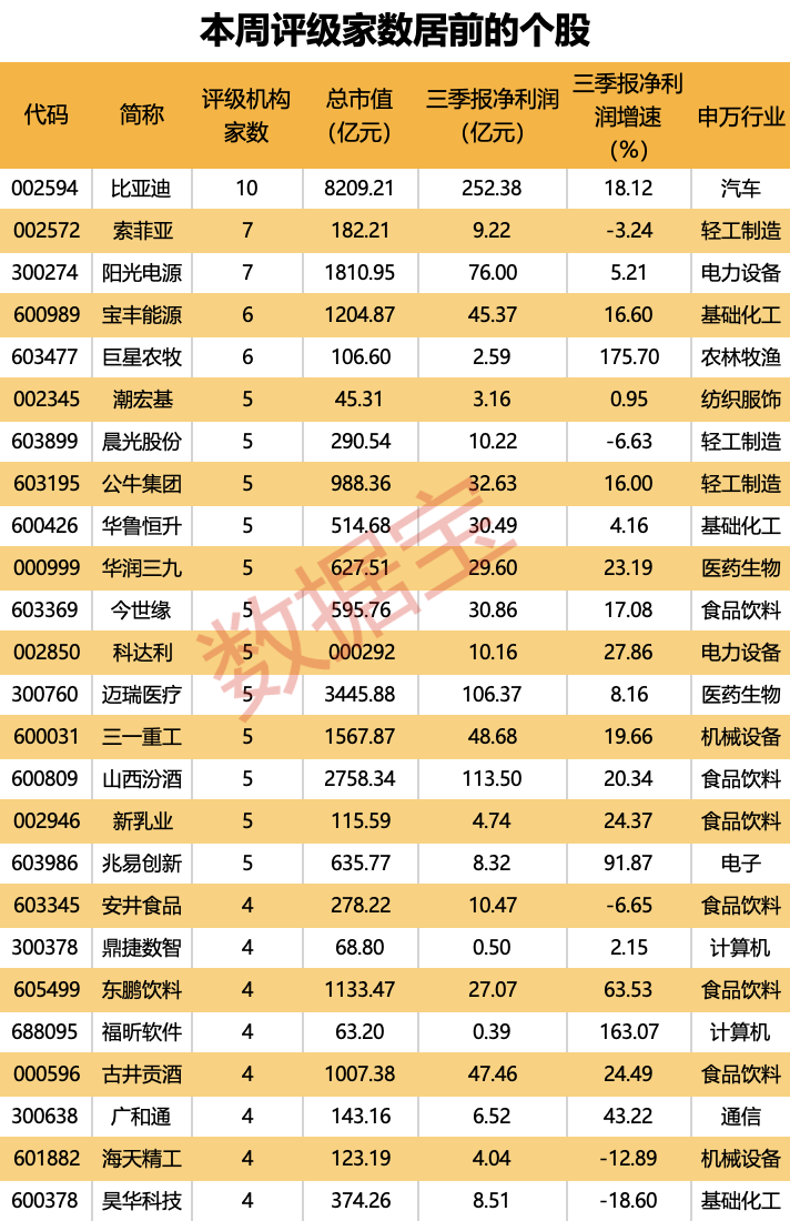 机构关注度最高的是比亚迪,共10家机构评级;其次,索菲亚、阳光电源均有7家机构评级。另外,宝丰能源、巨星农牧、潮宏基、晨光股份、公牛集团等大消费股均在榜。上述多只个股三季报业绩较为亮眼。