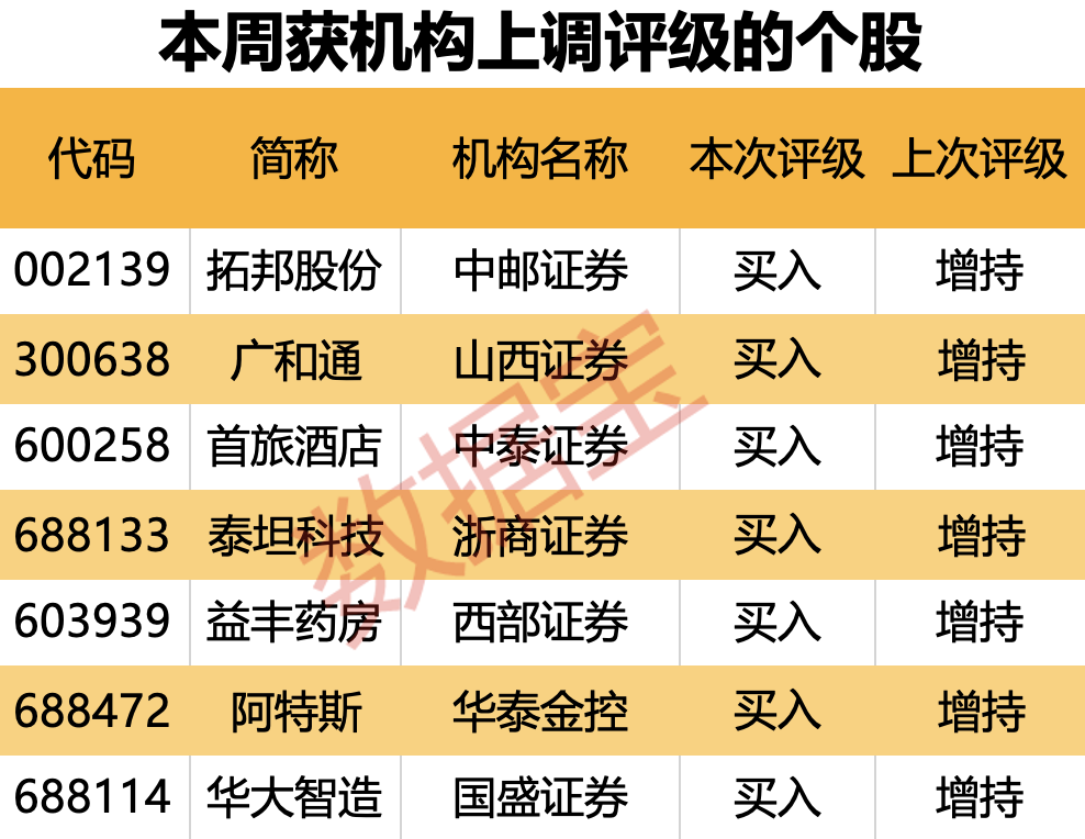 本周机构评级的个股中,10股机构一致预测价较最新收盘价上涨空间超50%;其中华泰证券给予埃斯顿“买入”评级,目标价不超过31.6元/股,上涨空间超80%。