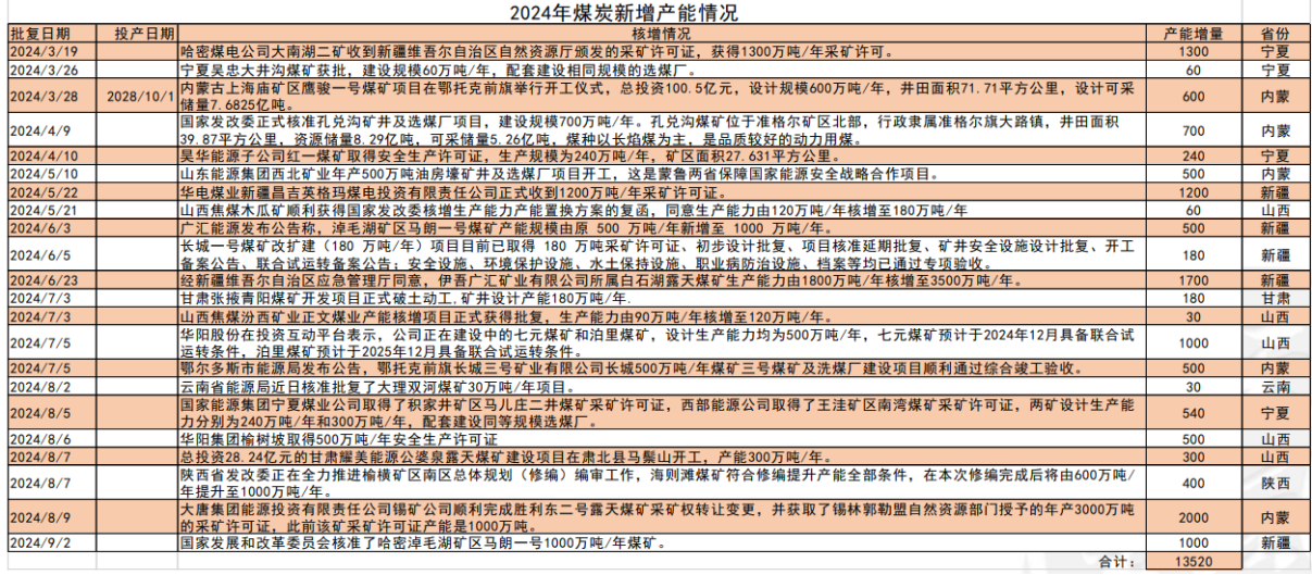 2023 年,原煤产量将接近 46 亿吨,我国煤炭产量和储量集中在山西、陕西、内蒙古和新疆,是我国四大主产煤区。根据公开发布的数据, 2023年达到51.4亿吨,到了2024年上半年,总需求为25.1亿吨,相比2023年同期有所下降。2022 年这四个地区的煤炭产量占全国的 81%。山西省 2022年同期累计原煤产量为 13.13 亿吨,2023 年为 13.57 亿吨,同比增长 3.3%。2023 年,原煤产量达 10 亿吨的省份还有内蒙古自治区,为 12.11 亿吨,陕西为 7.6 亿吨,新疆为 4.6 亿吨,贵州为 1.3 亿吨,安徽为 1.1 亿吨,河南为 1.02 亿吨。根据2024年公开消息,目前新增煤炭审核产能在1.35亿吨左右,2023年煤炭核准产能超过1亿吨,2024年基本和23年在新增产能方面相近。可以看出,我国是煤炭需求大国,煤炭每年需求量超51亿吨,而国内产量在47亿吨,每年还需要从海外进口一定量的煤炭。所以当下影响煤炭价格的主要矛盾还是在需求端,供给端虽然会影响价格,但是相对来说还是供给较为稳定的状态。展望四季度,如果没有明显不可抗力事件发生,煤炭供给端是稳定的,核心还是在需求端。