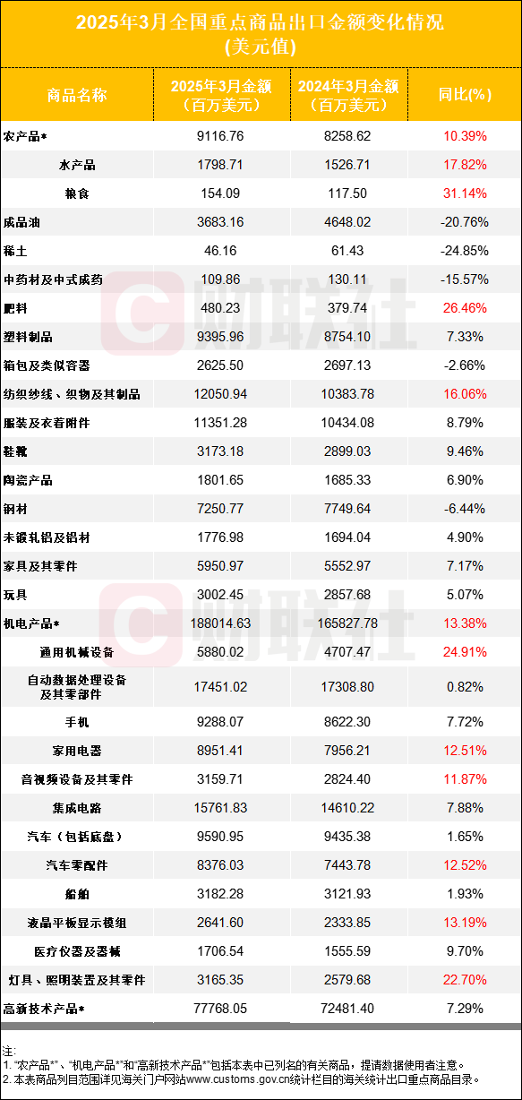 财联社整理今年3月重点商品出口金额变化情况发现: