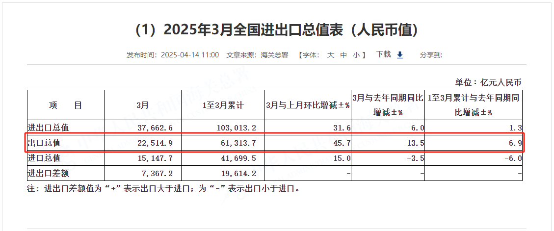 出口数据方面,一季度,我国出口规模突破6万亿元,同比实现6.9%的较快增长。3月出口规模为2.25万亿元,同比增长13.5%,环比激增45.7%。