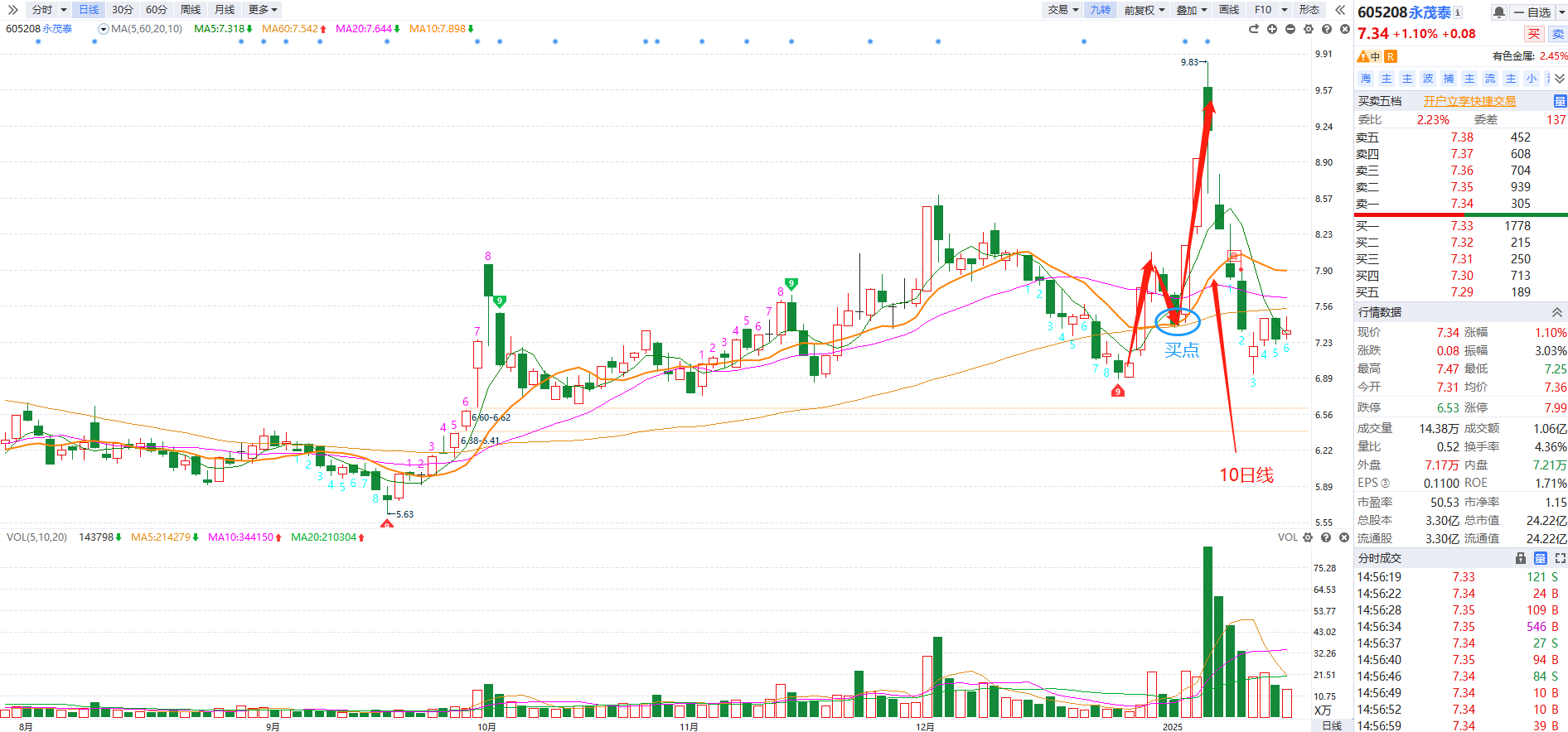 在第一步加入自选股后,接下来各位要做的就是认真跟综观察了,个股涨停之后,如果不是主力资金非常充裕或者市场行情非常好的话,基本就会步入震荡或调整态势(也就是所谓的洗盘),强势股回调一般是2-3天,且回调不破10日均线(非常强势的品种也会沿着5日线调整的),次强势的话,一般是3-5天回调至10或20日均线附近。