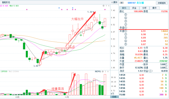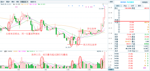 细节1:要求最大下跌不能超过涨停板实体的一半,在震荡的过程中,个股日成交量需连续高出成交量的20日均量线,同样是周期越短越好,一旦启动,比第一种情况更强势。