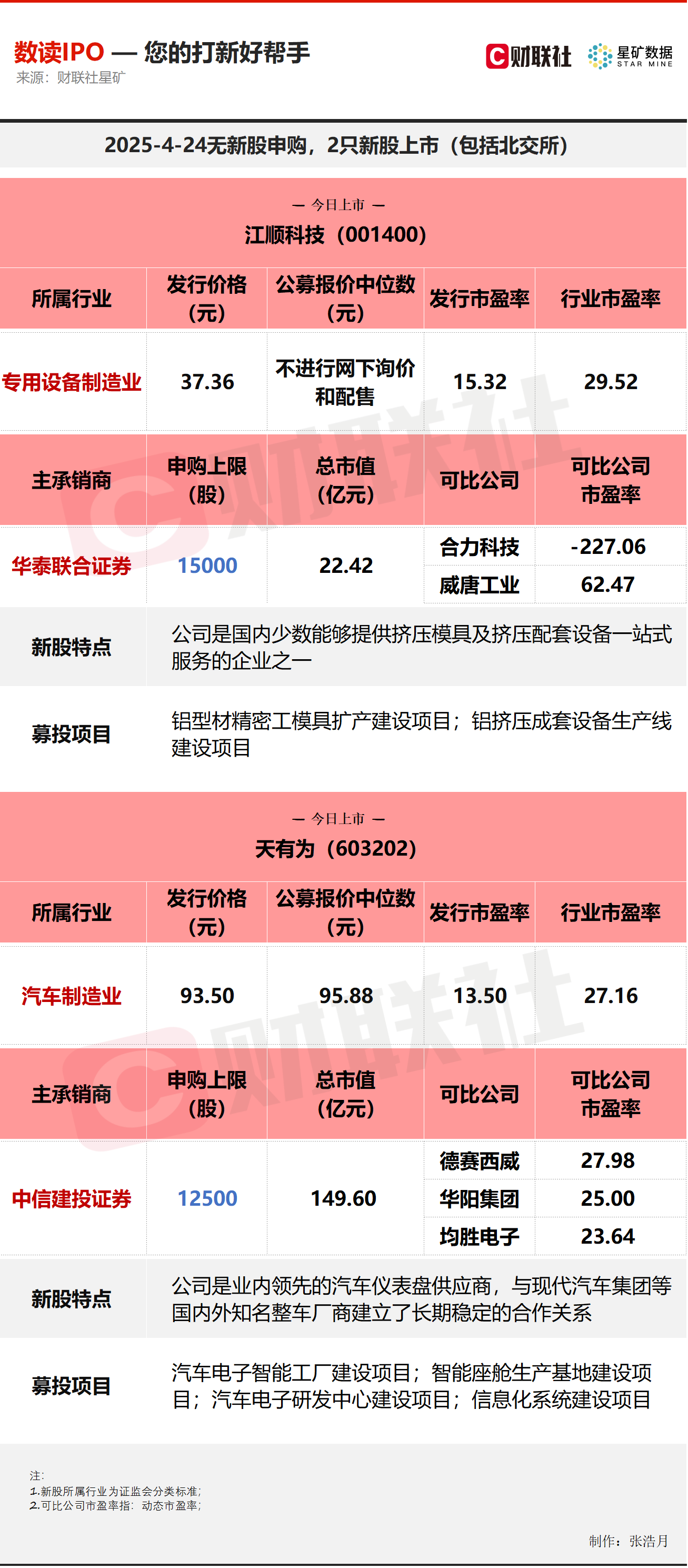 今日无新股申购;有2只新股上市,分别为深交所的江顺科技,沪市主板的天有为。