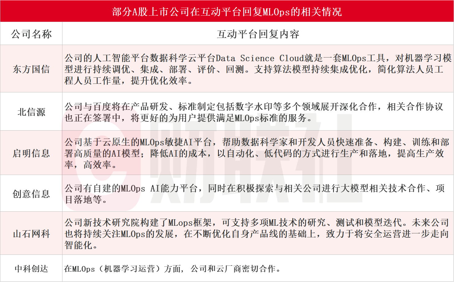 据财联社不完全统计,目前已有多家上市公司在互动平台回复在MLOps的相关情况,具体如下: