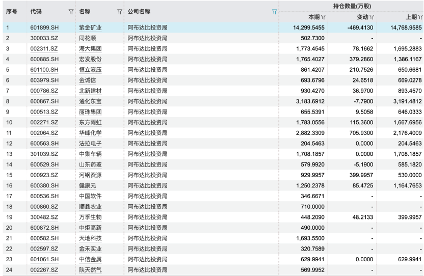 除此之外,阿布达比投资局还减持了通化东宝、山东药玻等股票,上季度大量持有的万华化学,该股的前十大流通股名单中也不再看到阿布达比投资局的身影。