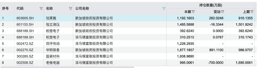增减持方面,GIC增持华明装备最多,为891.11万股,增持珀莱雅达到282.02万股。GIC则减持了恒立液压16.33万股,淡马锡减持了老板电器700万股。此外,淡马锡还新晋到了双环传动、国瓷材料等前十大流通股中,分别持有1226.29万股、1608.99万股。