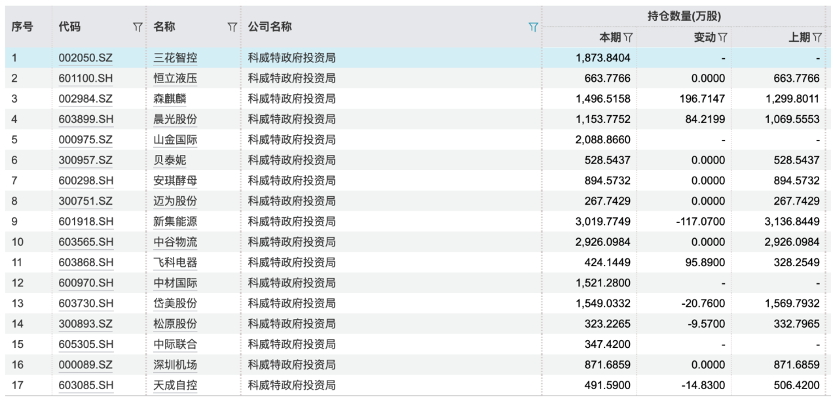 科威特投资局还新晋4家上市公司的前十大流通股东,为中际联合、中材国际、山金国际以及三花智控。其余个股持仓则保持不变。