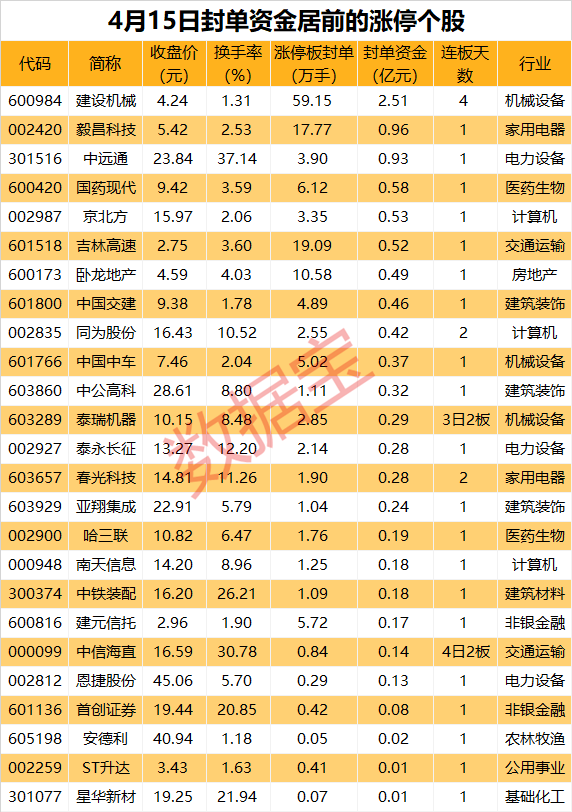 以封单金额计算,建设机械最高,封单资金达到2.51亿元,毅昌科技、中远通、国药现代紧随其后,分别为0.96亿元、0.93亿元、0.58亿元。