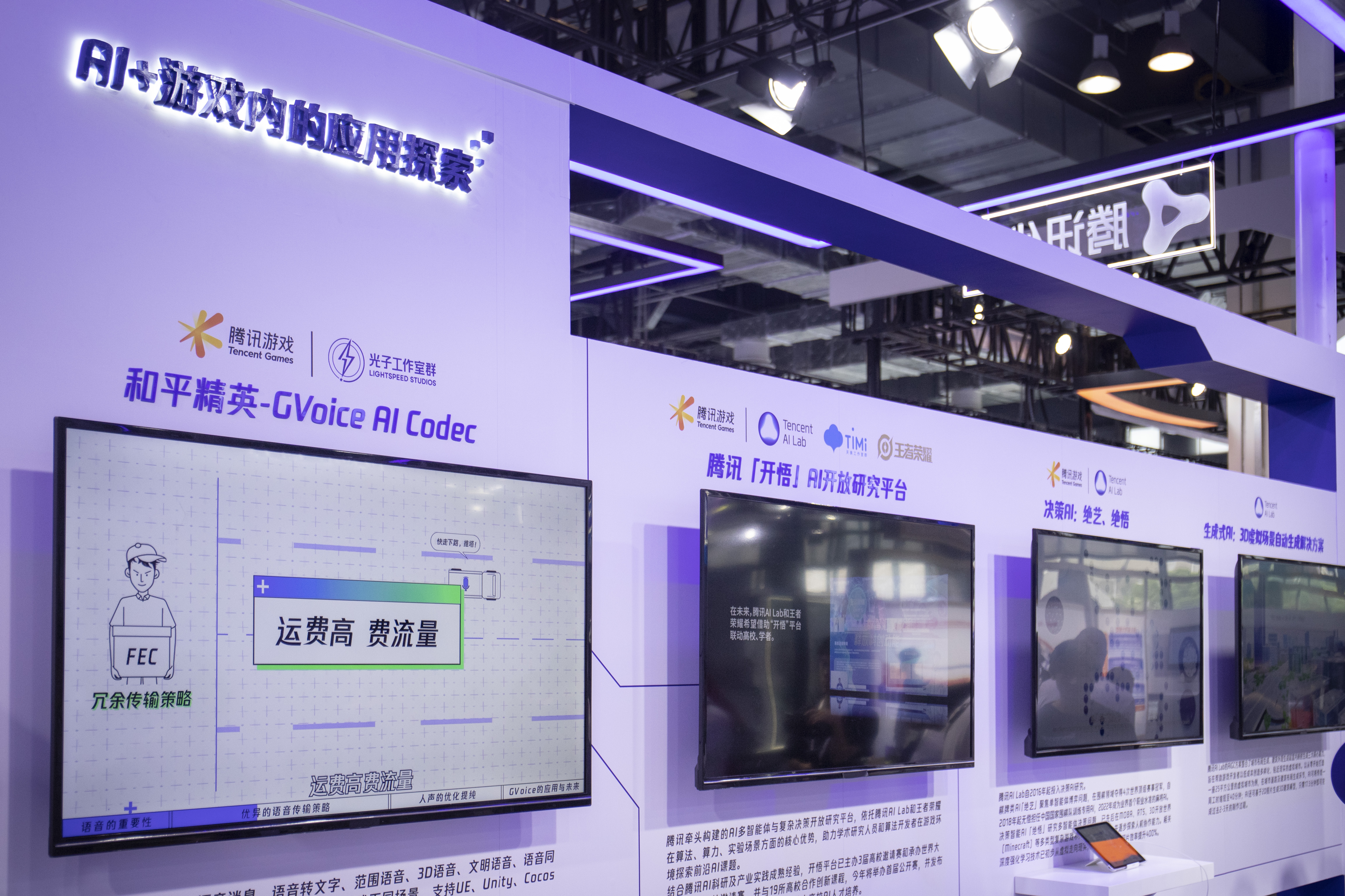 腾讯旗下天美工作室展出了与腾讯AILab联合开发的脸部表情及口型AI生成技术,基于多模态合成系统自动生成的脸部特征参数,可以提升游戏角色3D模型的拟真性,表现出趋近于真实的脸部细节。光子工作室将GVoiceAICodec技术应用到了《和平精英》游戏中,让游戏内语音通信带宽降低15%,环境噪音降低10-20%。