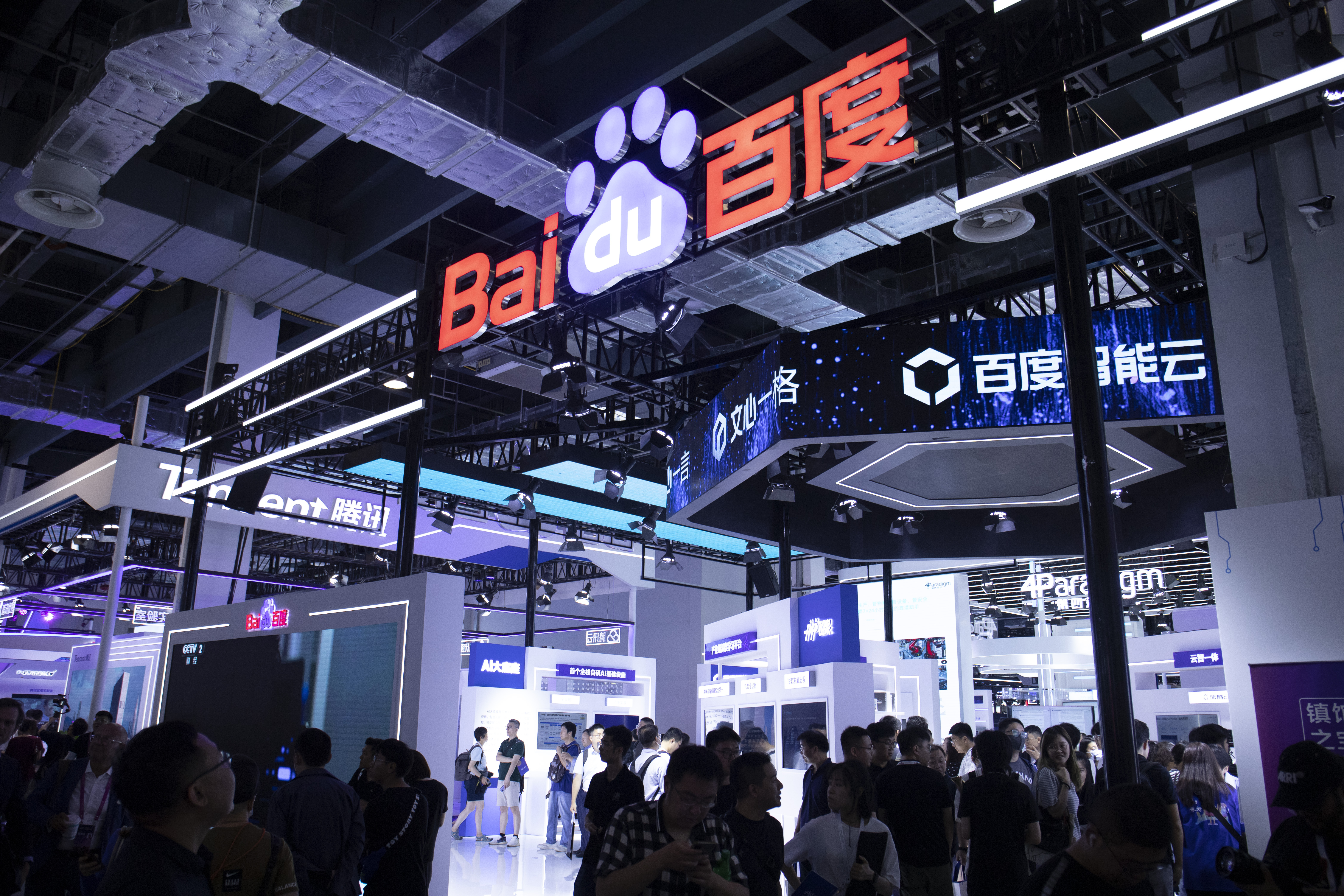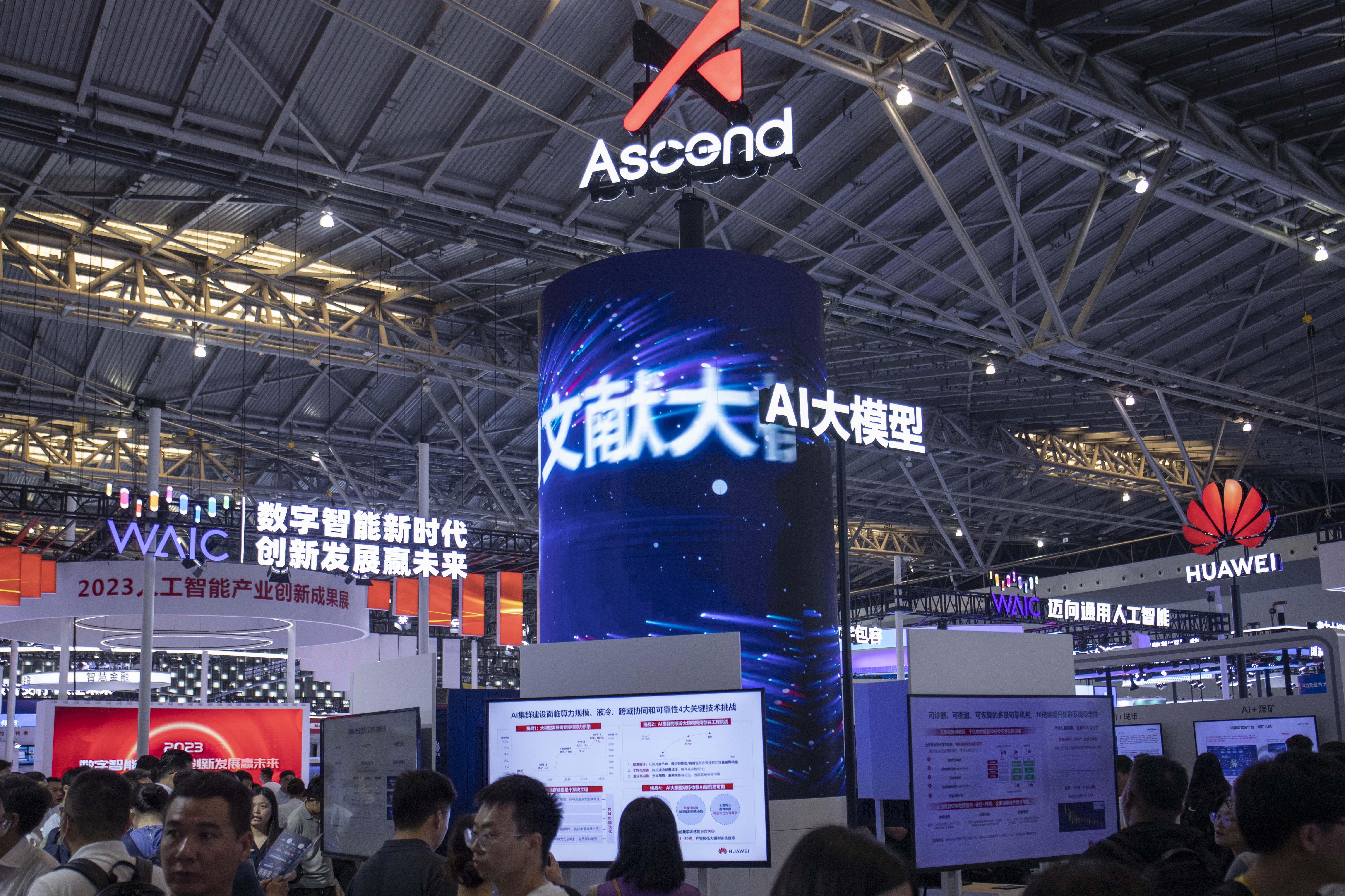在6日上午,第一财经记者来到了世博展览馆探展,尽管扩大了规模,展览现场仍然挤满了对AI感兴趣的各行业人士。在展商中,以华为、腾讯、阿里、百度为代表的互联网大厂仍然是展区的主力,大模型是C位角色,游戏、物流、工程机械领域也有不少前沿探索。