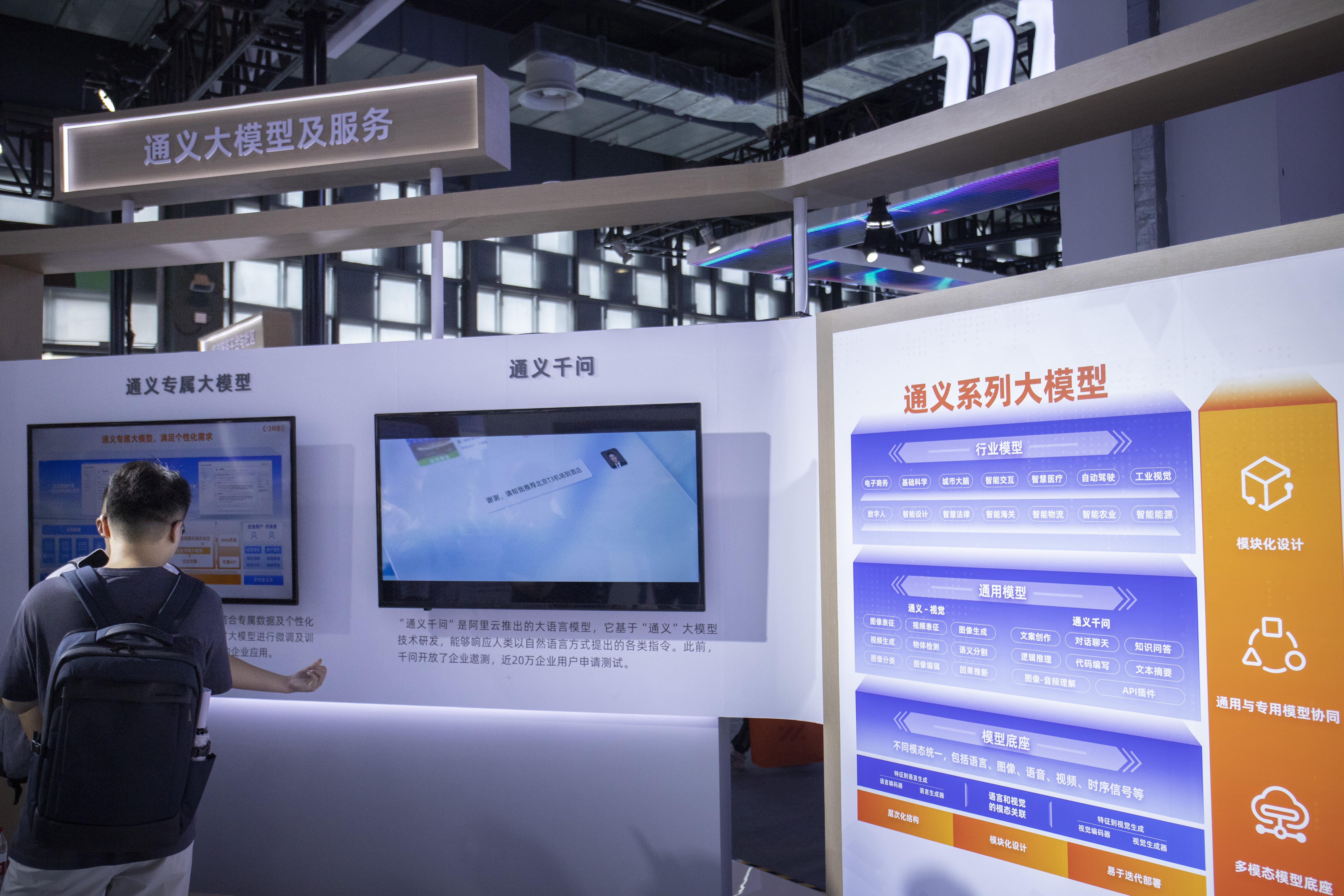 相对华为的高调,阿里巴巴则主要展出通义千问大语言模型及通义专属大模型,据介绍,其可以允许企业对大模型进行微调及训练,生成个性化API,供企业调用及封装成新的企业应用。