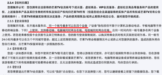芒果TV同一个帐号最多可以在4个设备上使用,支持移动端、电脑端同时2台在线,电视端同时2台在线,且同一时间内同一帐号最多在2个设备上使用,24小时内最多可以在5个不同城市登录。腾讯视频同一个账号最多可以在5个设备登录及使用。但其并未详细区分设备类别,只规定同一时间内同一VIP账号最多在两个设备上登录及使用。意味着用户可以同时在2个手机APP上使用。