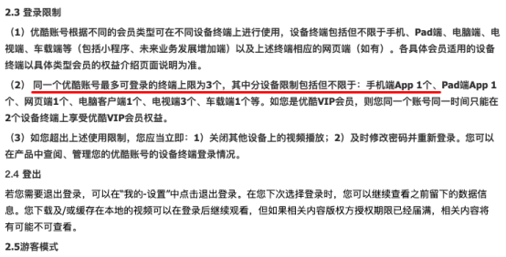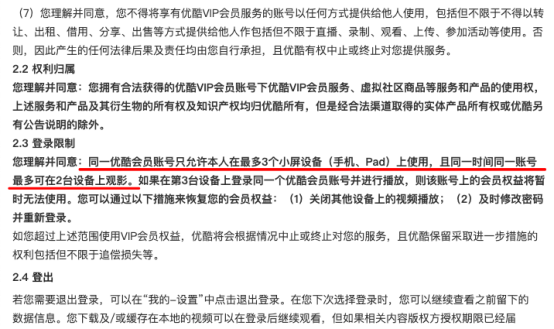 优酷还表示,VIP会员协议早已明确规定,会员服务是一项针对个人的、不可转让的、非商业用途的许可,用户仅可为非商业目的使用,并仅可用作个人观看,不得以转让、出租、借用、分享、出售等方式提供给他人。