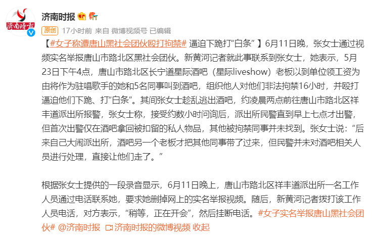 据济南时报报道,6月11日晚,张女士通过视频实名举报唐山市路北区黑社会团伙。新黄河记者就此事联系到张女士,她表示,5月23日下午4点,唐山市路北区长宁道星际酒吧(星际liveshow)老板以到单位领工资为由将作为驻唱歌手的她和5名同事叫到酒吧,组织他人对他们非法拘禁16小时,并殴打逼迫他们下跪、打“白条”。