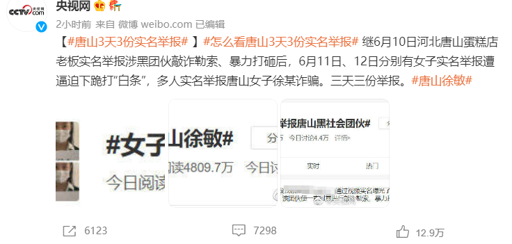 据央视网,继6月10日河北唐山蛋糕店老板实名举报涉黑团伙敲诈勒索、暴力打砸后,6月11日、12日分别有女子实名举报遭逼迫下跪打“白条”,多人实名举报唐山女子徐某诈骗。三天三份举报。