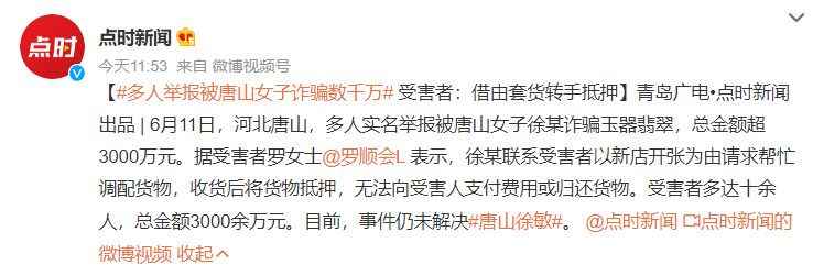 据青岛广电•点时新闻消息, 河北唐山,多人实名举报被唐山女子徐某诈骗玉器翡翠,总金额超3000万元。据受害者罗女士表示,徐某联系受害者以新店开张为由请求帮忙调配货物,收货后将货物抵押,无法向受害人支付费用或归还货物。受害者多达十余人,总金额3000余万元。