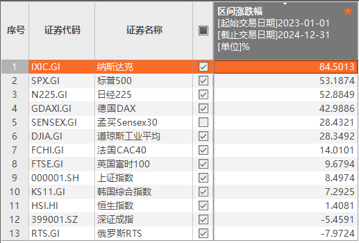 Choice数据显示,2023年初至2024年底,美国、日本和印度股市在全球市场中表现遥遥领先。其中,纳斯达克指数以84.5%的涨幅排名首位;标普500、日经225和孟买Sensex30分别上涨53.19%、52.88%、28.43%。
