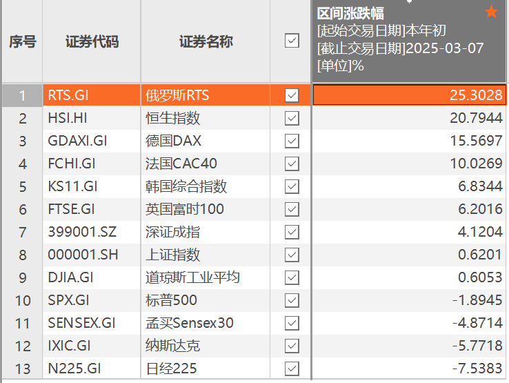 今年以来,全球市场涨幅“座次”出现明显变化。截至3月7日,俄罗斯RTS以25.3%的涨幅在全球重要指数中排名首位;恒生指数、德国DAX、法国CAC40指数分别上涨20.79%、15.57%、10%,排名第二至四位。与此同时,日经225以7.54%的跌幅排名垫底,纳斯达克和孟买Sensex30指数分列倒数第二和第三位。