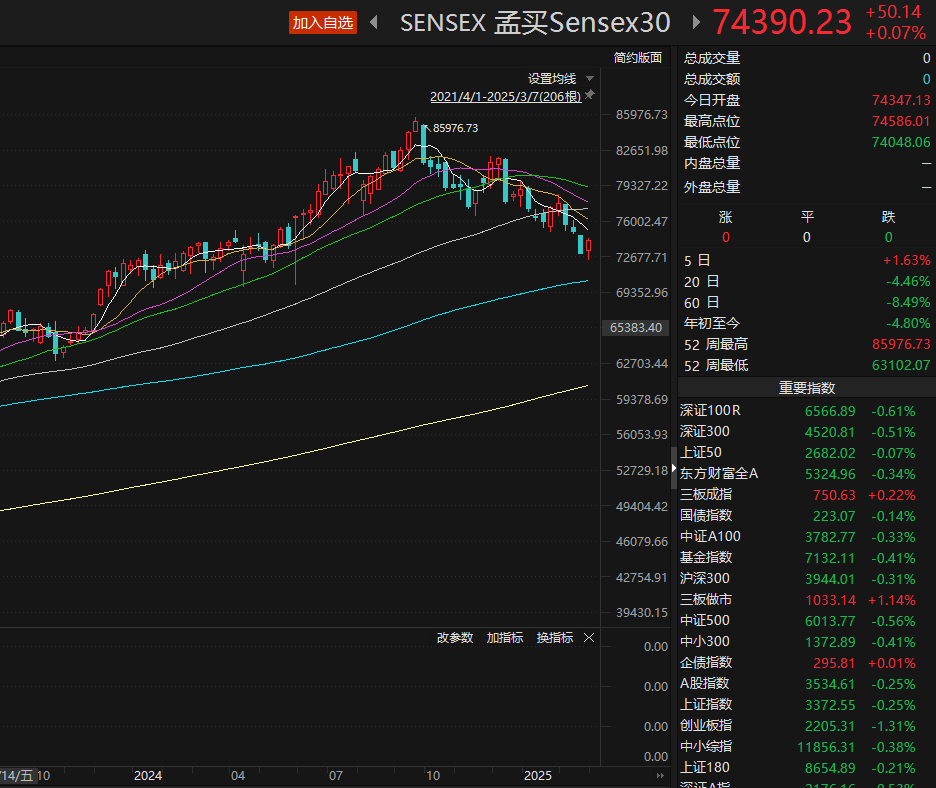 事实上,从2024年10月开始,印度股市便开始持续下跌。数据显示,去年9月底以来,外国投资者净卖出了价值约250亿美元的印度股票,其中仅在今年2月份就卖出了41亿美元。业内人士分析,印度股市下跌的主要原因是外国机构投资者大量撤资、印度经济增速放缓以及全球贸易紧张局势加剧。同时,印度上市公司盈利增长疲软和估值过高也是原因之一。