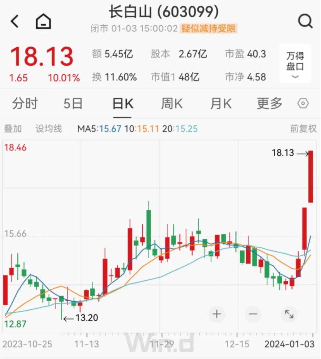 受此影响,旅游股长白山两连板,截至1月3日收盘,该股报18.13元/股。