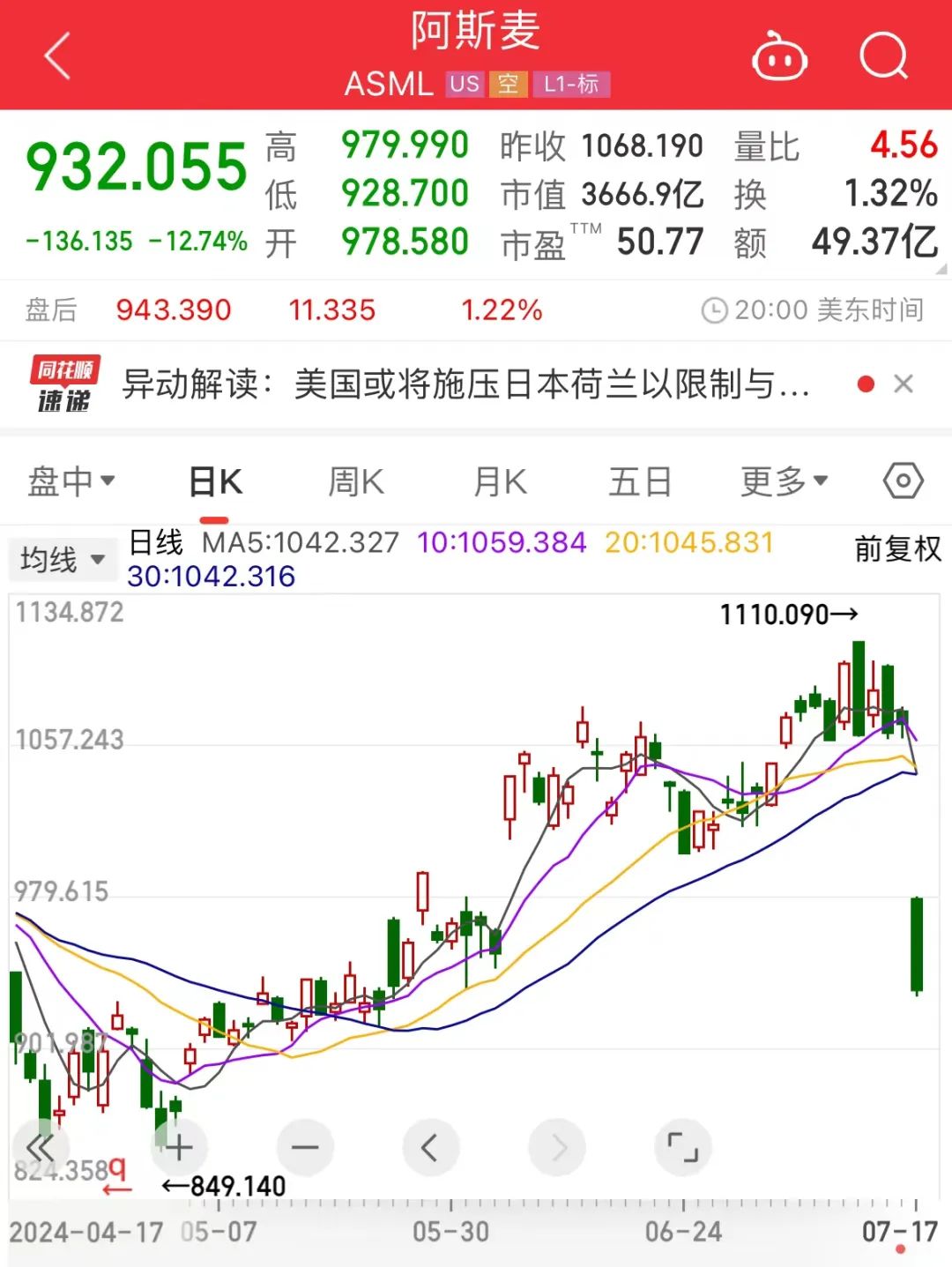 消息面上,由于阿斯麦第三季度业绩指引未能达到市场预期,加之美国再次向其盟友施压,要求限制与中国的芯片贸易,美国股市芯片股在盘前交易中普遍出现下跌。具体来看,最新市值超2.6万亿元的全球光刻机巨头阿斯麦股价下跌近13%。