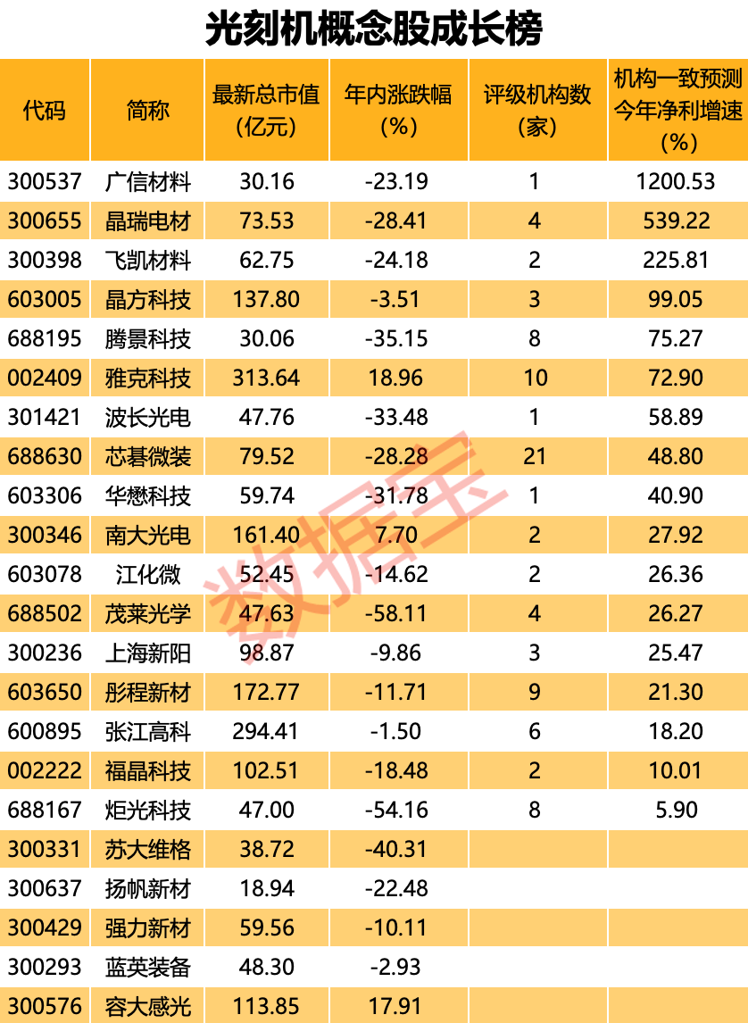 光刻机概念股今年业绩普遍向好。其中,广信材料机构一致预测今年净利增速超12倍居首。晶瑞电材、飞凯材料机构一致预测今年净利增速超两倍,晶方科技、腾景科技、雅克科技、波长光电今年预计增速均超50%。