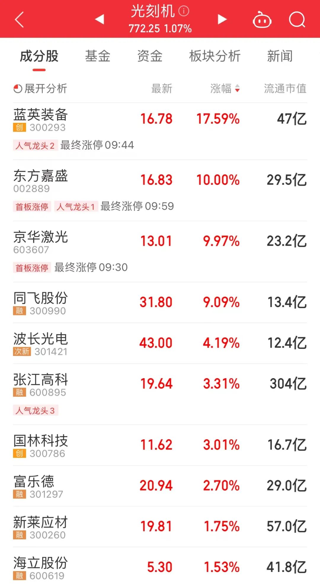 早盘,光刻机板块快速拉升,东方嘉盛、京华激光涨停,蓝英装备、同飞股份盘中20cm涨停,波长光电、张江高科、芯源微、容大感光、广信材料、富乐德、同益股份、艾森股份、强力新材等均跟涨。