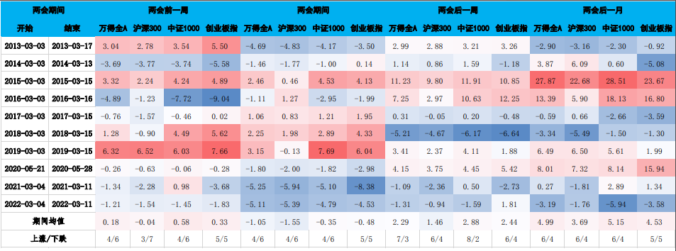 最后通过对近十年以来的历次重要会议期间的市场表现分析,我们发现历次重要会议前一周市场处于下跌年份居多(这其中2015年为整体大牛市),而在重要会议后上涨年份开始居多。